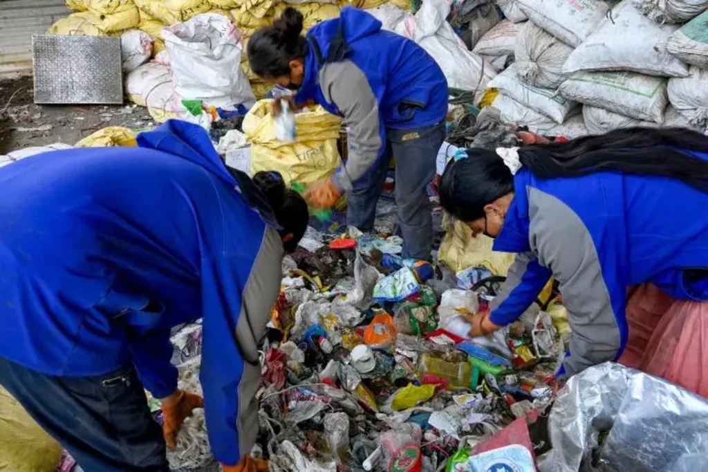 | Des personnes trient les déchets récupérés sur les pentes de l'Everest pour les recycler à Katmandou, le 12 juin 2024 au Népal. |