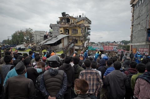| Des Népalais regardent les sauveteurs travailler à Katmandou le 28 avril. |