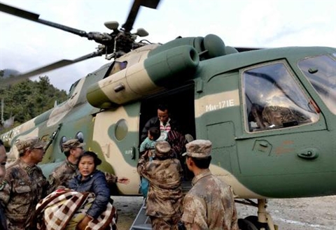 | Des hélicoptères font la navette le 27 avril pour secourir les habitants de Jilong. |