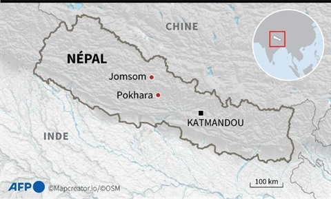 Jomsom, connue comme point de départ pour les randonneurs dans l'Himalaya, est à 20 minutes de vol de Pokhara, deuxième ville du pays, à 200 km à l'ouest de la capitale Katmandou.