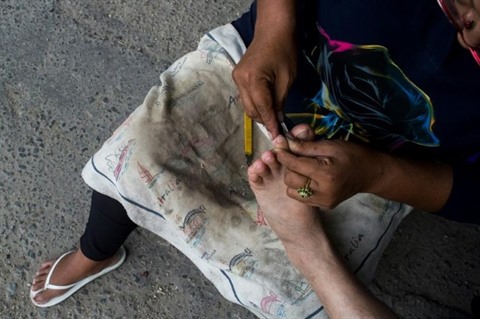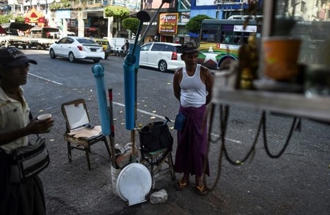 | Khin Ohn Myint, manicuriste et nettoyeuse d'oreilles, s'occupe le 4 décembre 2018 des ongles d'un client sous un pont, le long de la rue Pansodan, dans la capitale birmane Rangoun. |