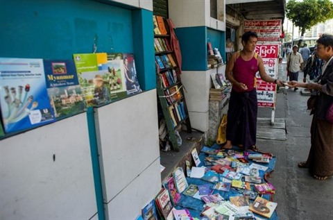 | Le bouquiniste Tin Than (à gauche) montre un livre à un client devant son étal installé à même la rue de Pansodan, dans la capitale birmane Rangoun, le 5 décembre 2018. |