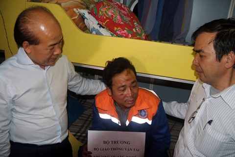 | Le vice-ministre des Communications et des Transports, Nguyên Van Công (gauche), rend visite à un membre d'équipage survivant du Hai Thanh 26, le 28 mars à Bà Ria-Vung Tàu (Sud). |