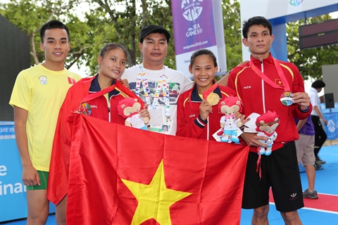 | En athlétisme, Nguyên Thi Thanh Phuc (2e à droite) a remporté le 6 juin à Singapour une médaille d'or. |