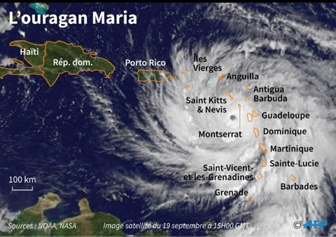 Depuis lundi 17 septembre, Maria traverse les Caraïbes déjà mises à mal par l'ouragan Irma, en apportant son lot d'inondations, de toits et arbres arrachés, de coupures d'électricité. Sur Sainte-Croix, une des Îles Vierges américaines, des rafales ont soufflé à 220 km/h, selon le NHC.