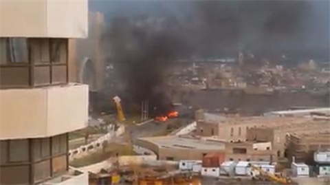 | Capture d'écran d'une vidéo AFPTV montrant de la fumée s'élevant de l'hôtel Corinthia, dans le centre de Tripoli, après une attaque par des islamistes, le 27 janvier. |