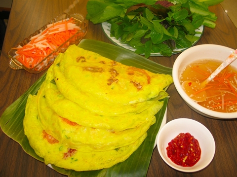 Le banh xèo (crêpe fourrée) est faite à base de farine de riz et de curcuma, pliée en deux et garnie avec de la viande de porc en tranche ou hachée, des crevettes, des graines et des germes de soja. Le banh xèo se mange avec des feuilles de moutarde ou des feuilles de salade ainsi que différentes herbes aromatiques et de la sauce de saumure aigre-douce.