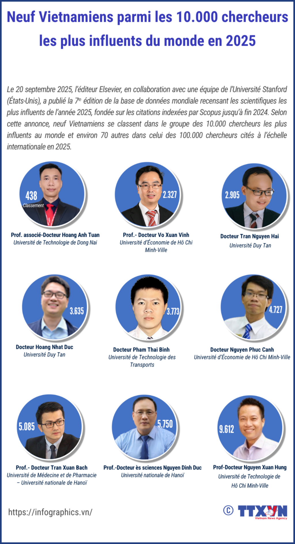 Le 20 septembre 2025, l’éditeur Elsevier, en collaboration avec une équipe de l’Université Stanford (États-Unis), a publié la 7ᵉ édition de la base de données mondiale recensant les scientifiques les plus influents de l’année 2025, fondée sur les citations indexées par Scopus jusqu’à fin 2024. Selon cette annonce, neuf Vietnamiens se classent dans le groupe des 10.000 chercheurs les plus influents au monde et environ 70 autres dans celui des 100.000 chercheurs cités à l’échelle internationale en 2025.