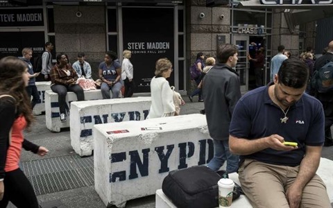 | Des piétons marchent devant des blocs de béton à New York le 5 juin. |