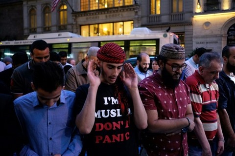 | Des musulmans ont prié devant la Trump tower au moment de l'Iftar, le 1er juin à New York. |
