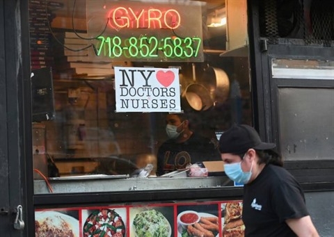 | Un homme portant un masque contre le coronavirus passe devant une pizzeria à Brooklyn, le 15 avril. |