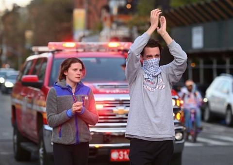 | Des passants applaudissent les soignants devant un hôpital new-yorkais, le 15 avril, dans le cadre de l'hommage aux soignants rendus tous les soirs à 19 heures. |