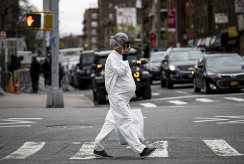 | Une femme enceinte, protégée de pied en cap contre le coronavirus, traverse une rue du quartier d'Elmhurst, à New York, le 27 avril. |