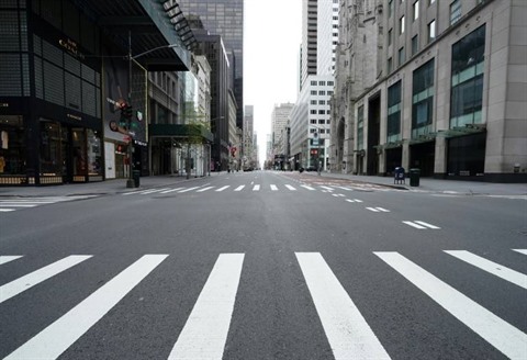 | La 5e Avenue, artère légendaire de Manhattan, désertée le 27 avril par la pandémie du coronavirus. |