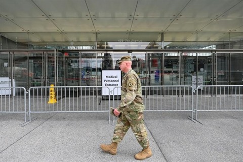 | Un soldat de la Garde nationale américaine devant le Centre de conférences Javits Center à Manhattan, |