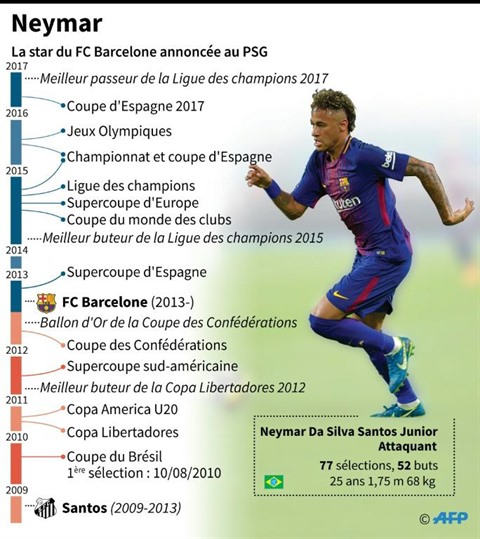 | Fiche sur l’attaquant brésilien Neymar, qui a fait ses adieux à ses coéquipiers du FC Barcelone et est annoncé au PSG. |