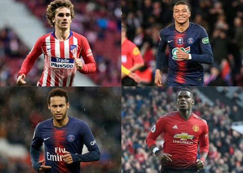 | Combophoto des principaux joueurs cités dan la rubrique des trandsferts: (gauche à droite) Antoine Griezmann, Kylian Mbappé, Neymar Jr et Paul Pogba, le 17 juin. |