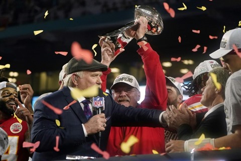 | Andy Reid, l'entraîneur de Kansas City (centre), avec le trophée du Super Bowl remporté le 2 février à Mimai (États-Unis). |
