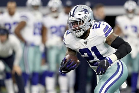 | La star des Dallas Cowboys, Ezekiel Elliott, lors d'un match NFL contre les Redskins de Washington à Arlington, au Texas, le 29 décembre 2019. |