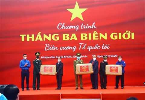 | Remise de cadeaux au district de Noong Het, province laotienne de Xieng Khouang, à la porte frontalière internationale de Nâm Can (commune éponympe, district de Ky Son, province de Nghê An). |
