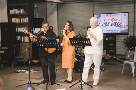 | Ngoc Ánh ici avec deux membres - les "sympathisants" vétérans - du Pasion Music Club (PMC) : Luu Thanh Dung, expatrié vietnamien en France, et Fabrice Mangione, expatrié français au Vietnam, à la Fête de la musique 2020. |