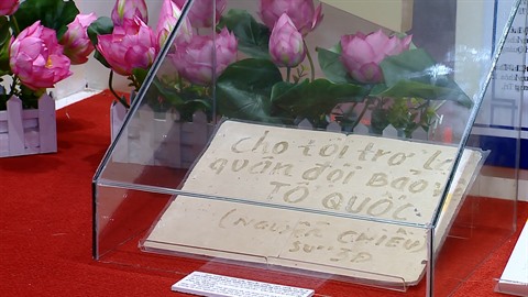 Aujourd'hui, nous sommes dans la salle traditionnelle de l'Université des sciences sociales et humaines (relevant de l'Université nationale de Hanoï). Au mur, une liste de noms de 27 héros morts pour la Patrie, tous étudiants et professeurs de cette université et une lettre particulière, exposée dans une vitrine. C’est une lettre écrite avec le sang de Nguyên Chiêu, étudiant du Département de l’histoire de l’Université de Hanoi (l'actuelle Université des sciences sociales et humaines), écrite il y a 40 ans. Dans cette lettre, il y a seulement dix mots en vietnamien: "Cho tôi tro lai quân dôi bao vê tô quôc'' (je voudrais aller au champ de bataille pour protéger la Patrie). Chaque mot écrit montre la volonté et la force pour surmonter les difficultés afin de protéger l’indépendance, la souveraineté et l’intégrité territoriale du pays de Nguyên Chiêu.