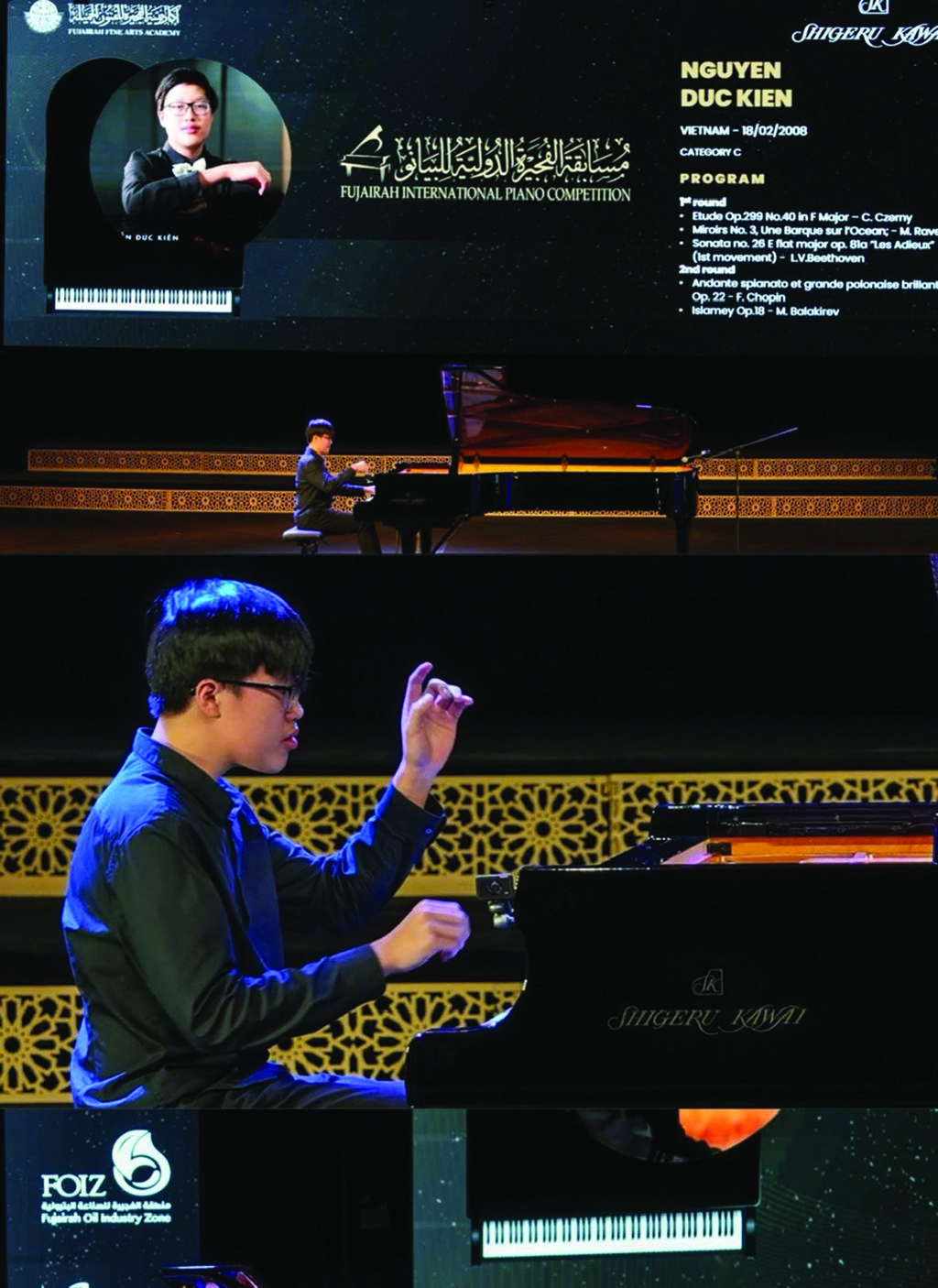 Avant cette performance exceptionnelle à Fujairah, Nguyên Duc Kiên s’était déjà distingué en remportant de nombreux prix lors de prestigieux concours de piano, tant nationaux qu’internationaux. Parmi ses distinctions les plus notables, on peut citer : le Prix spécial du Concours international de piano pour jeunes talents aux États-Unis en 2018, le premier prix du Concours de piano de l’ASEAN en Chine en 2019 (catégorie professionnelle 13-17 ans), un diplôme d’honneur pour sa qualification en finale du Concours international de piano Rachmaninoff pour jeunes pianistes à Veliky Novgorod, en Russie, en 2023 ; ainsi que le deuxième prix (catégorie B) de la discipline piano au concours “Musique d’automne”, organisé par le ministère de la Culture, des Sports et du Tourisme du Vietnam en 2023 à Hanoï.