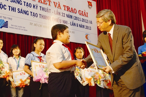 | Kim Hao reçoit le 1er prix au Concours de créativité des jeunes de Hô Chi Minh-Ville 2013. Photo : Manh Linh/VNA/CVN |