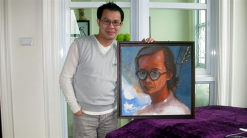 | Nguyên Huu Thai Hoà à côté d’un portrait de son idole, le compositeur Trinh Công Son. Photo : CTV/CVN |