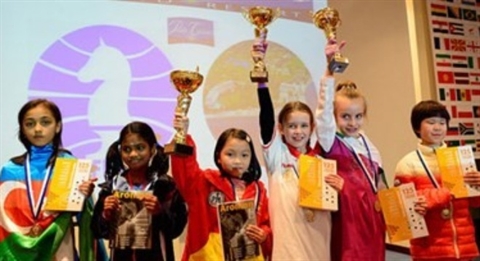 | Nguyên Lê Câm Hiên (centre) remporte le Championnat du monde junior dans la catégorie U8. |