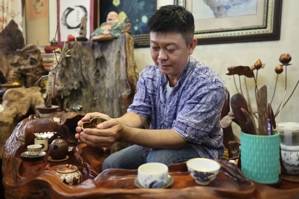 Le salon de Nguyên Lê Uyên Viên ressemble à un espace zen avec des statues et tableaux bouddhistes. Une grande vitrine expose des centaines de tasses de thé.