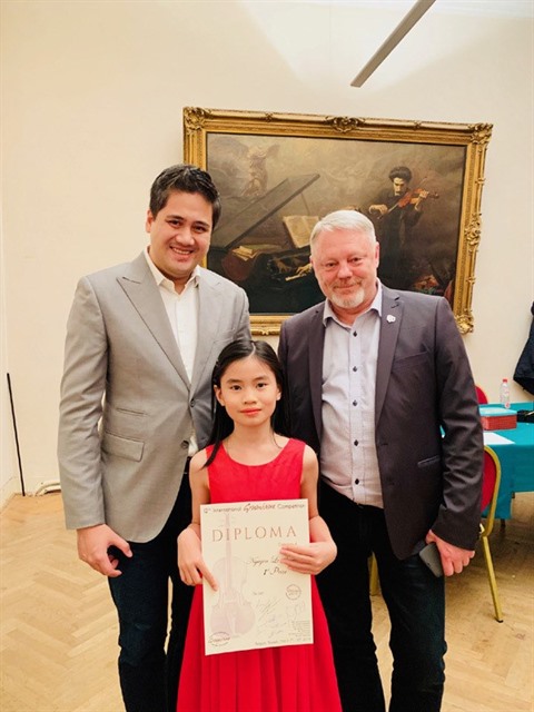 | Nguyên Nguyên Lê (robe rouge), son enseignant Bùi Công Duy et le président du jury Igor Tkatchouk. |