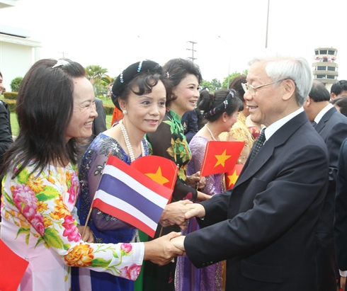 | Le secrétaire général du PCV, Nguyên Phu Trong (droite), est accueilli par les Viêt kiêu, le 27 juin dans la province thaïlandaise de Nakhon Phanom. |
