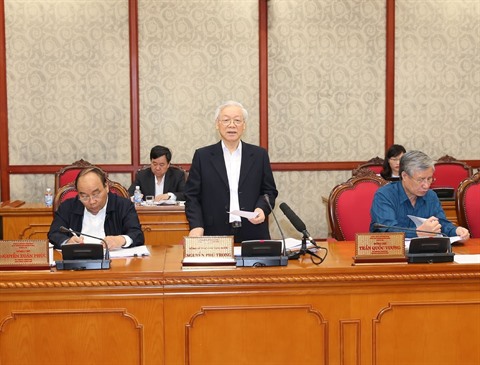 | Le secrétaire général du Parti communiste du Vietnam et président Nguyên Phu Trong (debout) lors de la réunion du Politburo le 21 mars à Hanoï. |