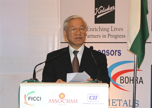 | Le secrétaire général du Parti communiste du Vietnam, Nguyên Phu Trong, au Forum d'entreprises indiennes, le 22 novembre dans la ville de Mumbai, capitale de l'État Maharashtra. Photo : Trí Dung/VNA/CVN |