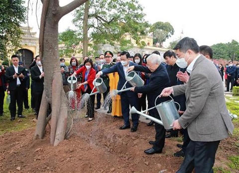 | Le secrétaire général du Parti et président de la République, Nguyên Phu Trong (cheveux blancs), et d'autres dirigeants plantent des arbres à la Cité impériale de Thang Long, à Hanoï. |