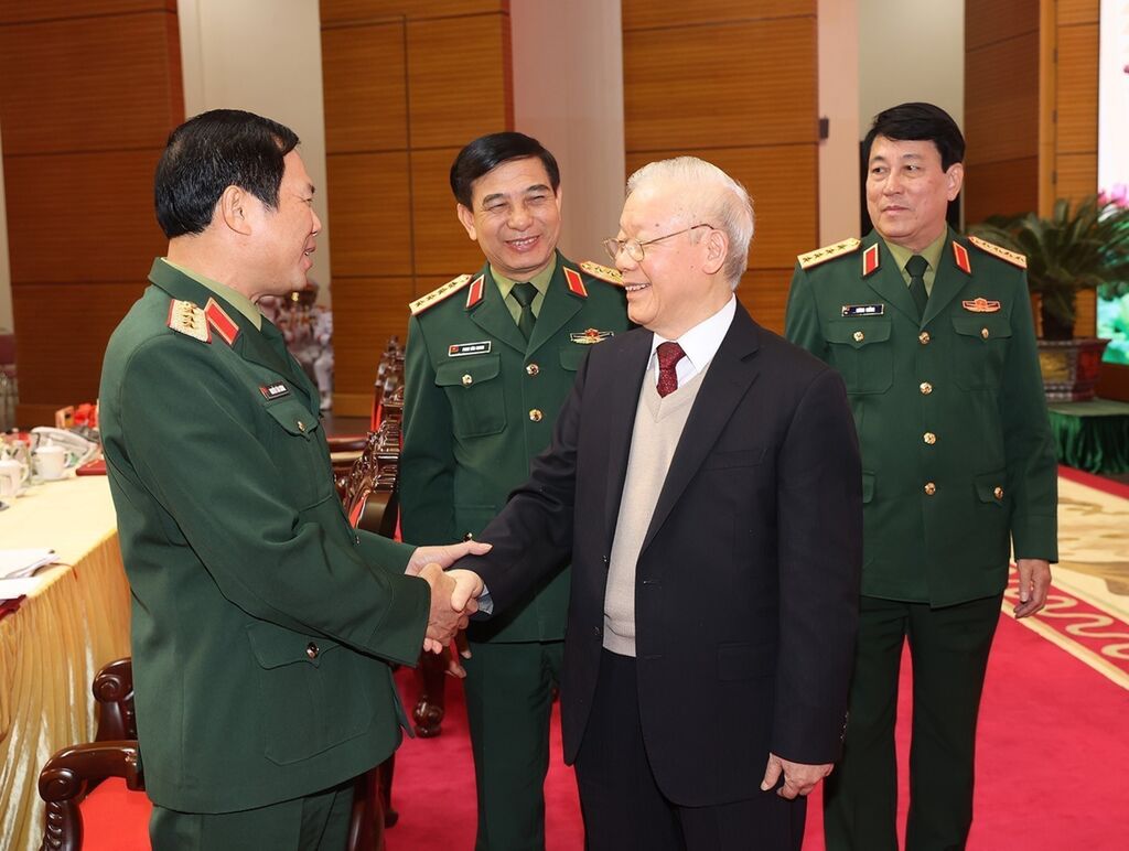| Le secrétaire général du Parti, Nguyên Phu Trong, et des responsables du ministère de la Défense, en décembre 2022. |