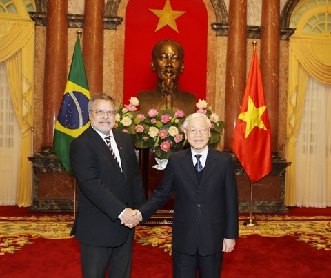 | Le secrétaire général du Parti communiste et président du Vietnam, Nguyên Phu Trong (droite), reçoit le 16 janvier à Hanoï l'ambassadeur du Brésil, Fernando Aparício da Silva. |