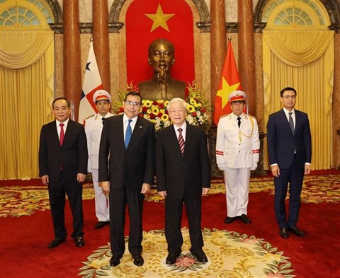 | Le secrétaire général du Parti et président de la République, Nguyên Phu Trong (droite), et le nouvel ambassadeur du Panama au Vietnam, Eligio Alberto Salas De Leon, le 17 mars à Hanoï. |