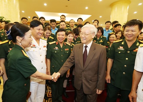| Le secrétaire général du PCV avec des syndicalistes de l'Armée populaire à Hanoï. |