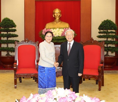 | Le secrétaire général du Parti communiste vietnamien, Nguyên Phu Trong, et la présidente de l’Assemblée nationale du Laos, Pany Yathotou. |