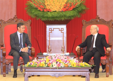 | Le secrétaire général du Parti communiste du Vietnam, Nguyên Phu Trong (à droite) et le nouvel ambassadeur du Laos au Vietnam, Thongsavanh Phomvihane, le 26 novembre à Hanoi. |