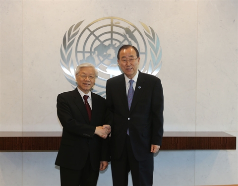 | Le secrétaire général du Parti communiste du Vietnam (PCV), Nguyên Phu Trong (gauche), et le secrétaire général de l’ONU, Ban Ki-moon, le 10 juillet au siège des Nations unies à New York. Photo : Tri Dung/VNA/CVN |