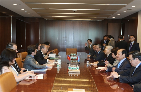 | Une entrevue entre le secrétaire général Nguyên Phu Trong et le secrétaire général de l’ONU, Ban Ki-moon, le 10 juillet au siège des Nations unies à New York. Photo : Tri Dung/VNA/CVN |