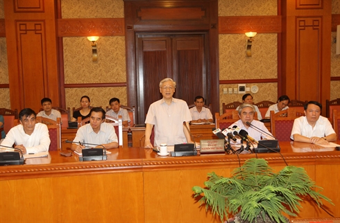 | Le secrétaire général du PCV, Nguyên Phu Trong (debout), travaille avec le Conseil de théorie du CC du PCV, le 26 juin à Hanoi |