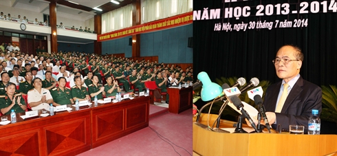 Nguyên Sinh Hùng a assisté mercredi 30 juillet à Hanoi à la clôture de l'année scolaire 2013-2104 de l'académie. Il a demandé aux cadres et officiers d'appliquer les connaissances apprises durant leurs études pour accomplir ces deux tâches essentielles que sont édifier et protéger la Patrie.