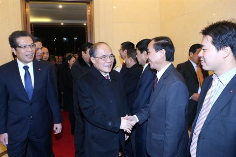| Nguyên Sinh Hùng (centre) rencontre des cadres de l’ambassade du Vietnam et les représentants de la communauté des Vietnamiens travaillant et résidant en Chine, le 23 décembre à Pékin. |