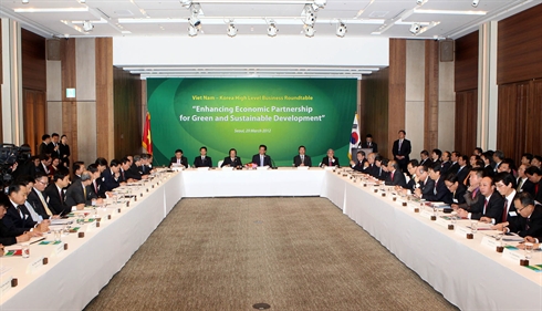 | Le Premier ministre Nguyên Tân Dung (centre) a participé le 29 mars à une table ronde à Séoul avec des entreprises sud-coréennes. Photo : Duc Tam/VNA/CVN |