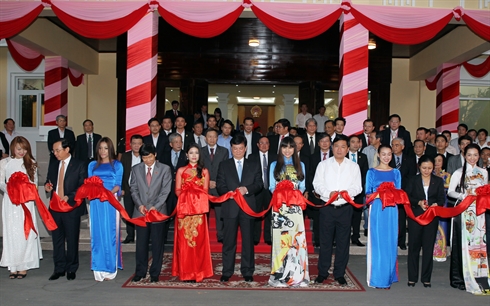 | Le Premier ministre Nguyên Tân Dung (centre) coupe la bande d'inauguration du nouveau siège de l'ambassade du Vietnam au Cambodge, le 12 janvier. |