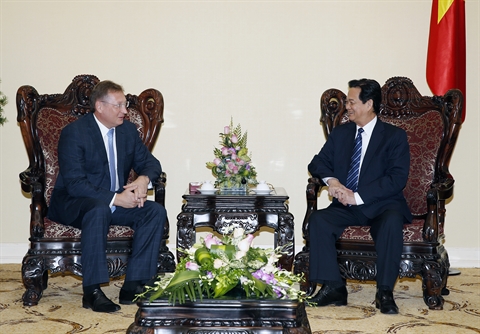 | Le Premier ministre vietnamien Nguyên Tân Dung (droite) et le directeur général du Groupe gazo-pétrolier russe Zarubezneft, Sergey Kudryashov, le 25 septembre à Hanoi. |